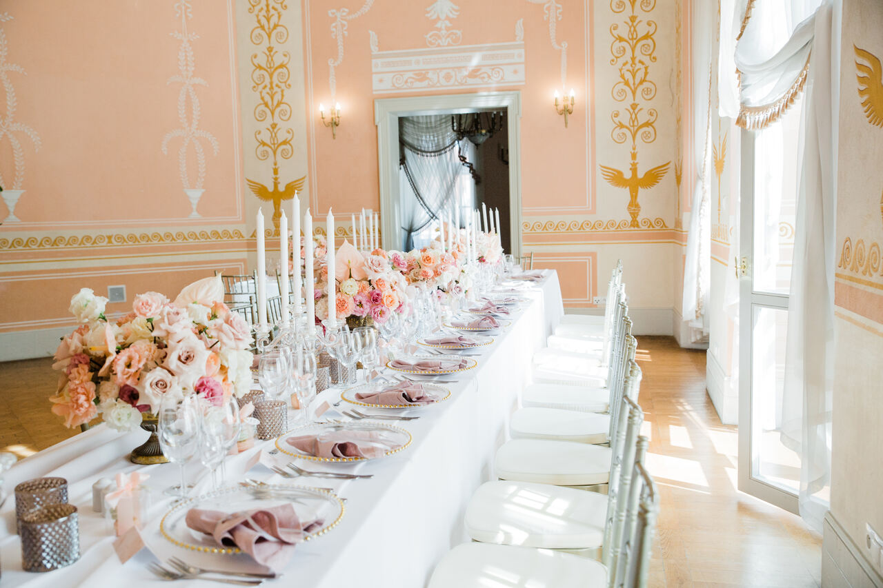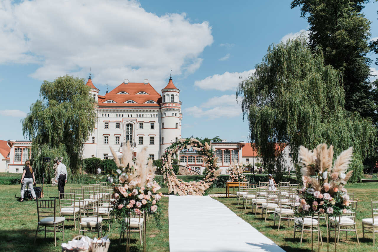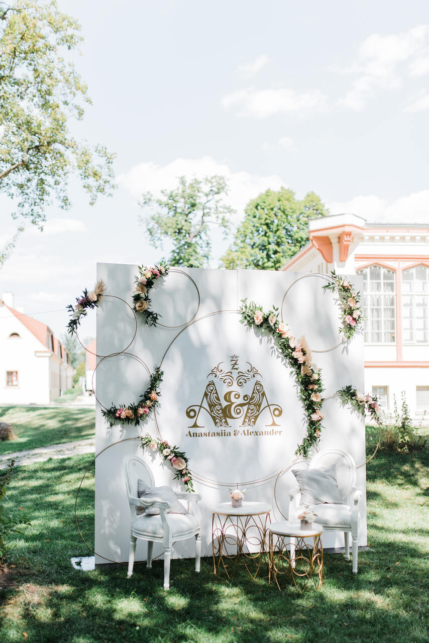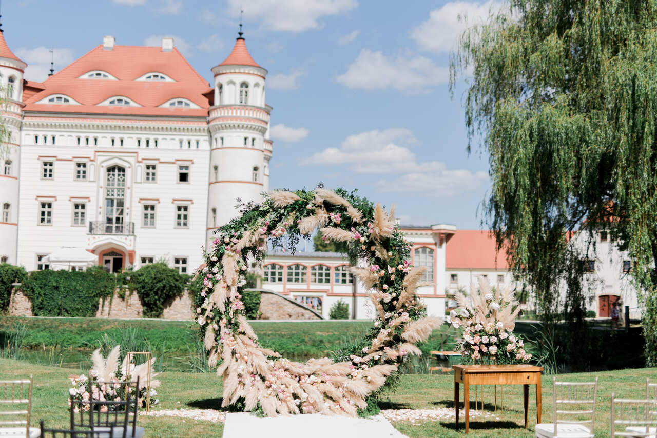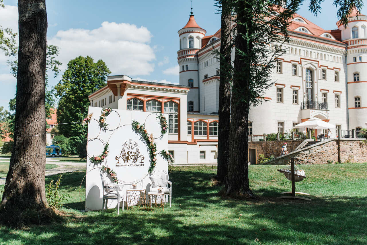 My couple decided on an intimate wedding in the Polish mountains. But as you probably know, intimate does not mean boring or small. The three-day celebrations were planned so that the festivities would be endless. We chose a palace in southern Poland as the venue for the wedding and reception. The guests' trip to Poland was also an opportunity for them to get to know this new country. A humanist ceremony with a view of the Wojanów Palace, dinner in the ballroom, fireworks, cake, and a mix of Polish and Russian traditions. Yes, it was an unforgettable weekend full of emotions for the bride and groom, but also for the guests and for us, the subcontractors. Every detail was planned, from the initials on the invitations and the photo wall to the peaches as part of the decoration. A small wedding can also be beautiful!