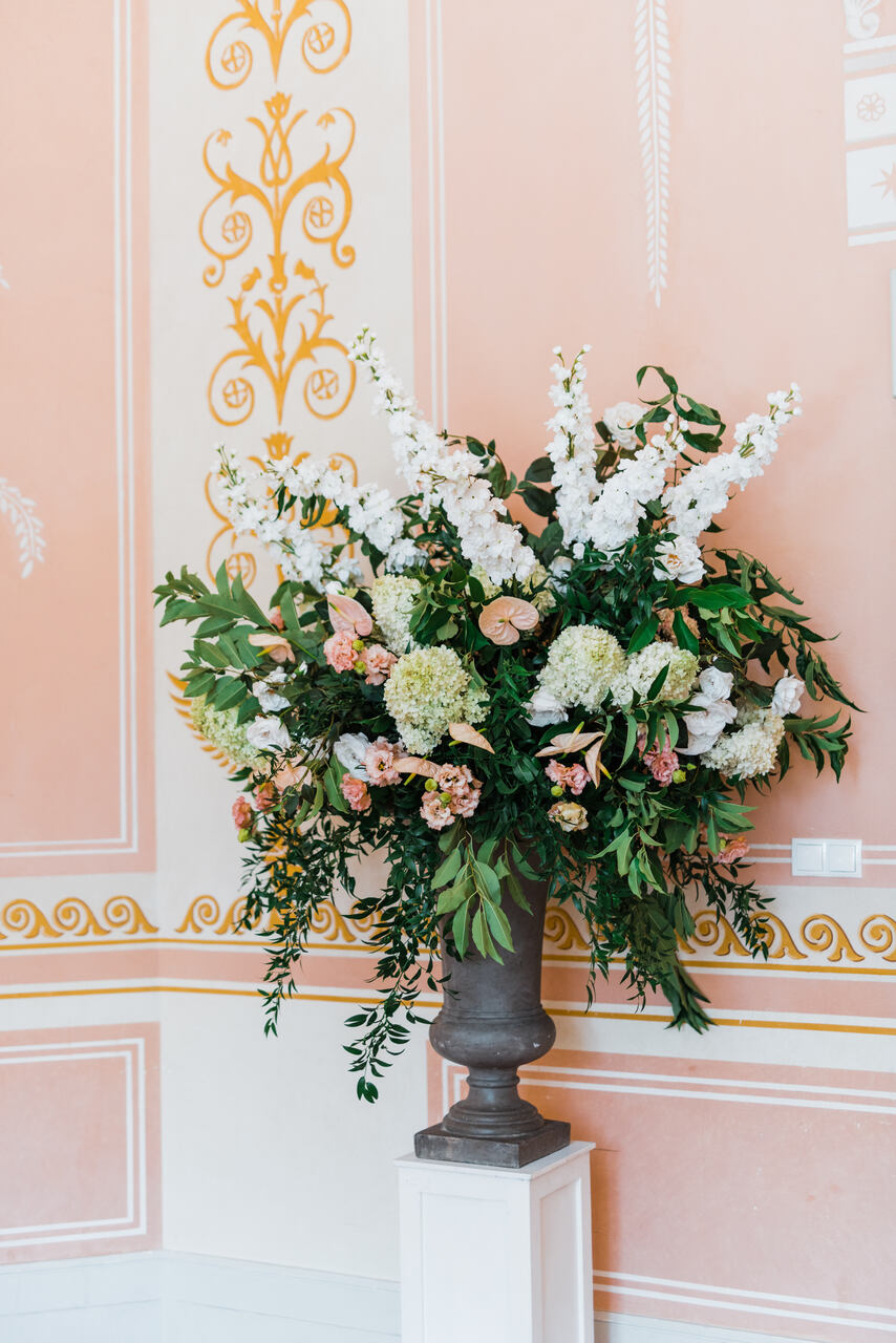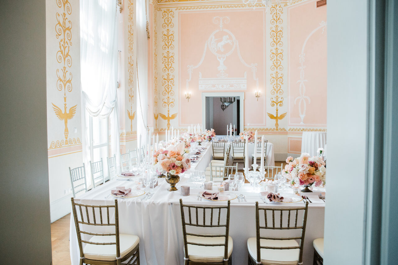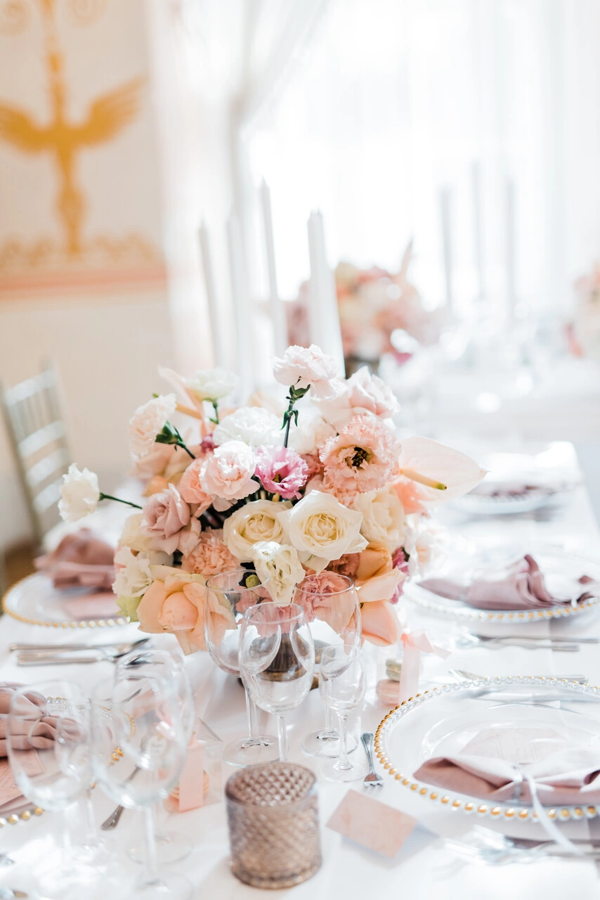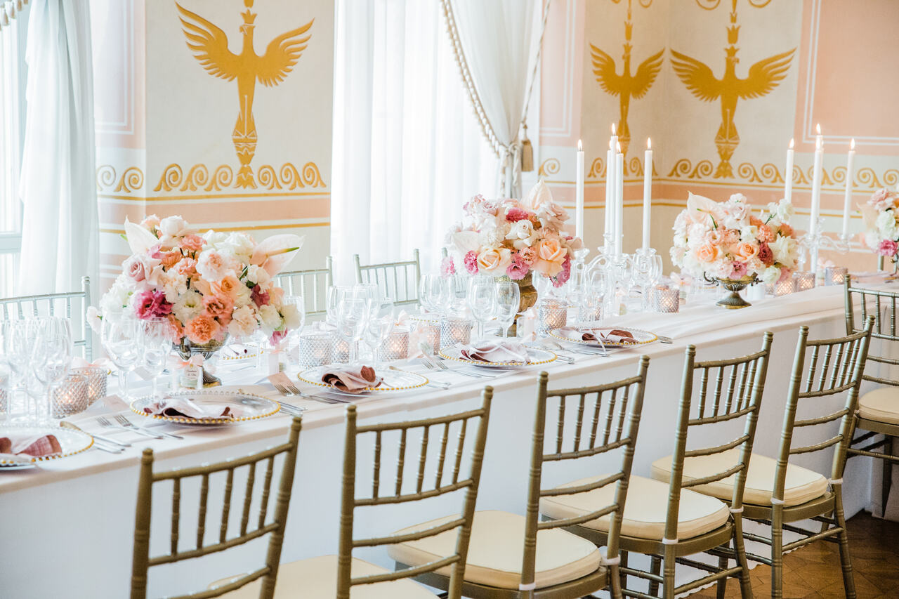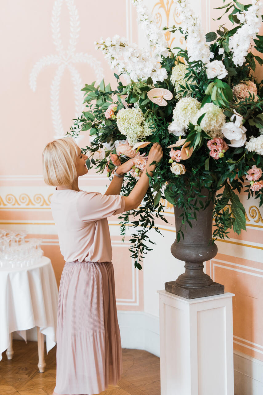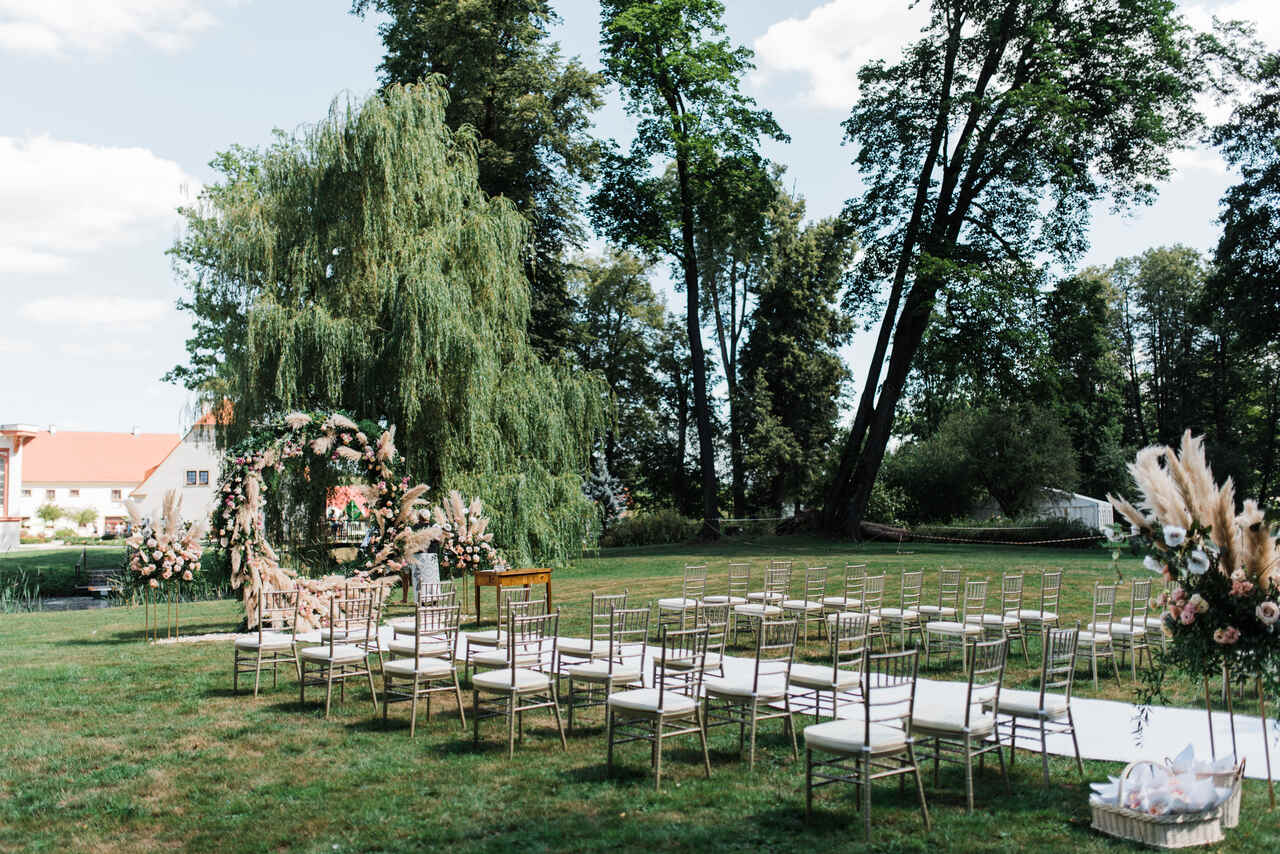 My couple decided on an intimate wedding in the Polish mountains. But as you probably know, intimate does not mean boring or small. The three-day celebrations were planned so that the festivities would be endless. We chose a palace in southern Poland as the venue for the wedding and reception. The guests' trip to Poland was also an opportunity for them to get to know this new country. A humanist ceremony with a view of the Wojanów Palace, dinner in the ballroom, fireworks, cake, and a mix of Polish and Russian traditions. Yes, it was an unforgettable weekend full of emotions for the bride and groom, but also for the guests and for us, the subcontractors. Every detail was planned, from the initials on the invitations and the photo wall to the peaches as part of the decoration. A small wedding can also be beautiful!